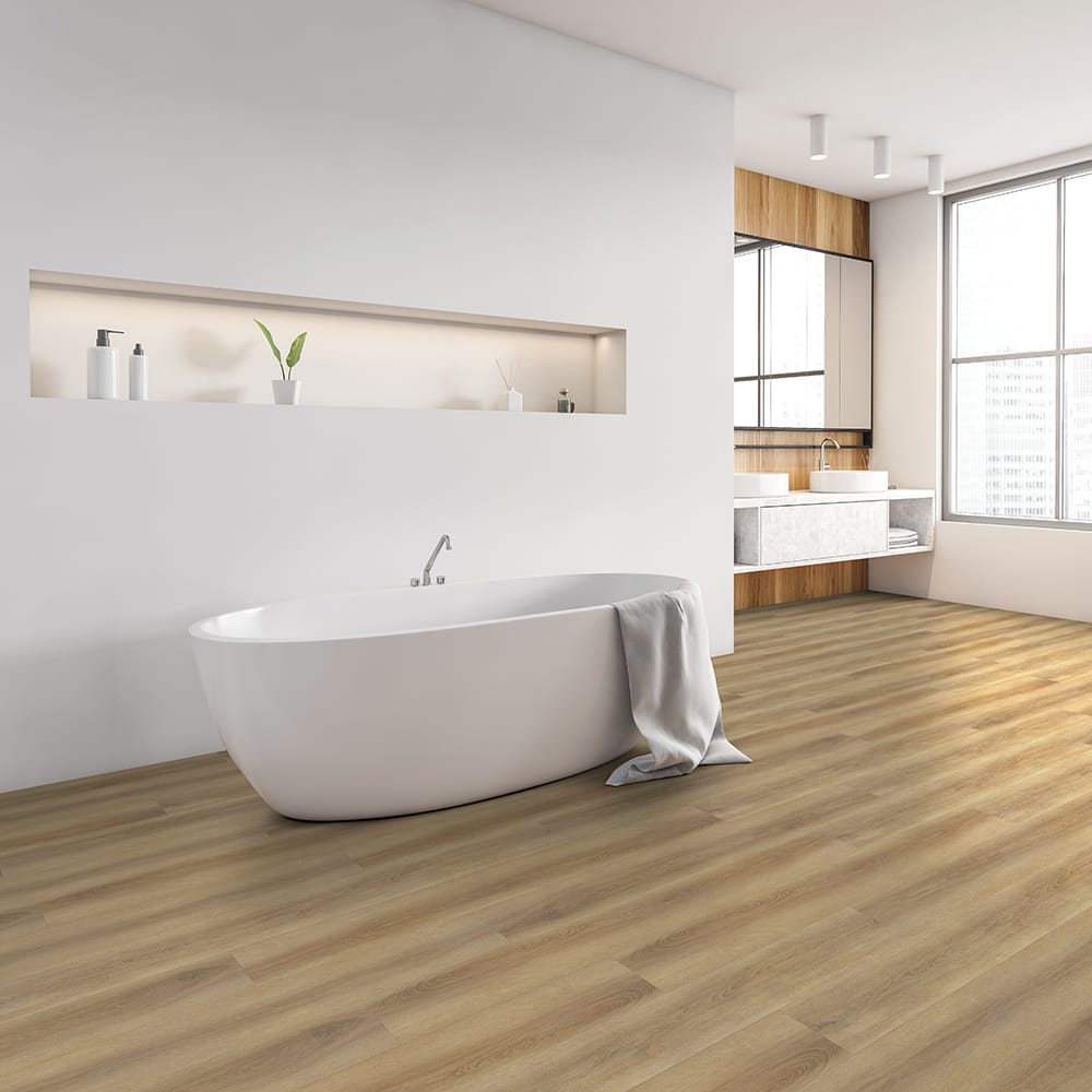 Wooden and white bathroom with bathtub with towel, side view, large window with city view. Minimalist design of modern white bathroom with wooden floor 3D rendering, no people